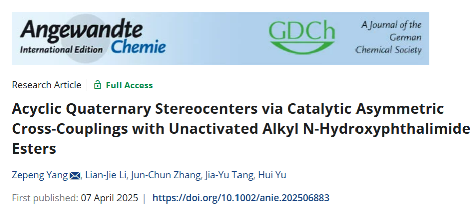 近日,化学科学与工程学院杨泽鹏教授课题组基于丰产金属催化不对称偶联反应的研究兴趣,开发了一种基于光氧化还原/铁/手性路易斯酸三重协同催化的策略,成功构建了一系列含链状季碳手性中心的化合物。相关研究成果以“Acyclic Quaternary Stereocenters via Catalytic Asymmetric Cross-Couplings with Unactivated Alkyl N-Hydroxyphthalimide Esters”为题在线发表于化学领域知名学术期刊《德国应用化学》(Angewandte Chemie International Edition)。