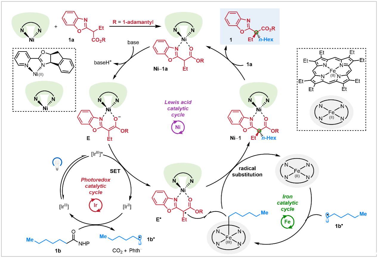 在最优条件下,反应具有良好的底物普适性,且克级规模反应可以顺利进行。作者还对反应机理进行了深入探讨,提出了可能的催化循环。首先,手性Lewis酸催化剂与底物1a配位形成Ni‒1a络合物,并在碱作用下原位生成烯醇镍中间体E;激发态的光催化剂[IrIII]*氧化E生成手性三级烷基自由基物种E•;被还原的光催化剂[IrII]将非活化一级烷基NHP酯1b还原为一级烷基自由基1b•;1b•与二价铁物种结合生成三价烷基铁;随后,E•与三价烷基铁通过外球机制发生快速自由基取代反应,生成Ni‒1并再生Fe(OEP)(II);最终,配体交换释放出含链状季碳手性中心的目标产物1,并完成催化循环。