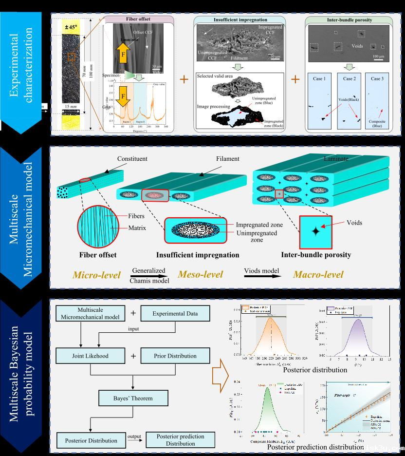 为此,taptap网页版登录kino航空航天与力学学院李岩教授团队提出了一种多尺度的贝叶斯方法,实现了3D打印连续纤维增强复合材料宏观力学性能与微结构参数的跨尺度协同不确定性量化分析。首先基于图像识别、张量分析和快速傅里叶变换技术,表征了打印复合材料的关键微结构参数分布;其次结合复合材料平均场均匀化理论和束间孔隙模型,建立了3D打印复合材料的各向异性多尺度本构理论;最后发展结合本构理论的多层级贝叶斯方法,全面量化了3D打印复合材料的宏观力学性能和微结构参数的不确定性。该概率方法实现了3D打印连续纤维增强复合材料本构参数的不确定性量化与溯源分析,为其高性能化设计与制造提供理论指导。相关研究成果以“A multiscale Bayesian method to quantify uncertainties in constitutive and microstructural parameters of 3D-printed composites”为题发表于固体力学旗舰期刊《固体力学与物理学杂志》(Journal of the Mechanics and Physics of Solids)。
