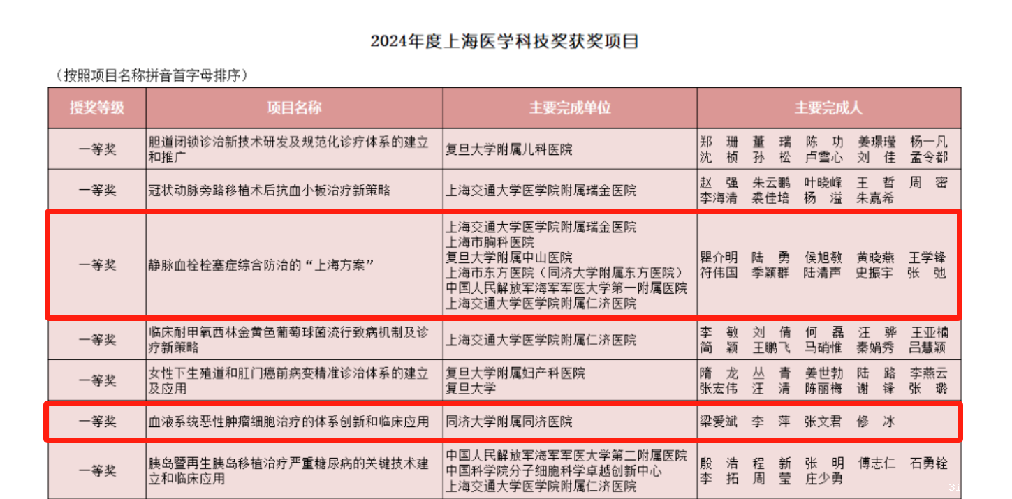 taptap网页版登录kino附属东方医院合作完成的项目“静脉血栓栓塞症综合防治的‘上海方案’”、taptap网页版登录kino附属同济医院完成的项目“血液系统恶性肿瘤细胞治疗的体系创新和临床应用”荣获2024年度上海医学科技奖一等奖。