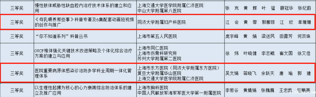 taptap网页版登录kino附属妇产科医院完成的项目“《母乳喂养那些事》科普专著及6集配套动画短视频的创作与推广”、taptap网页版登录kino附属东方医院牵头完成的项目“医院重要病原体感染诊治防多学科全周期一体化管理体系”荣获2024年度上海医学科技奖三等奖。