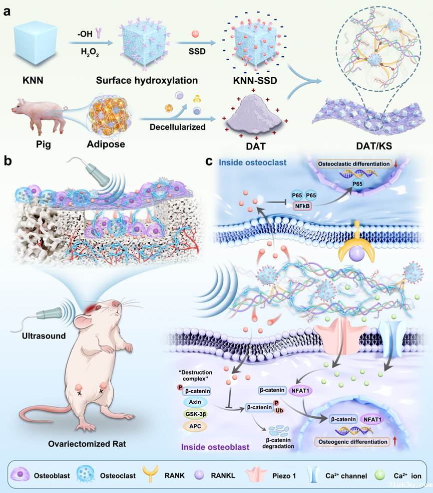 本文成功开发了一种超声响应的压电复合膜(DAT/KS),该膜通过“双向调节”策略同时促进成骨分化和抑制破骨细胞生成,有效恢复骨稳态并增强骨质疏松性骨修复,为骨质疏松性骨缺损的治疗提供了新的潜在方法。