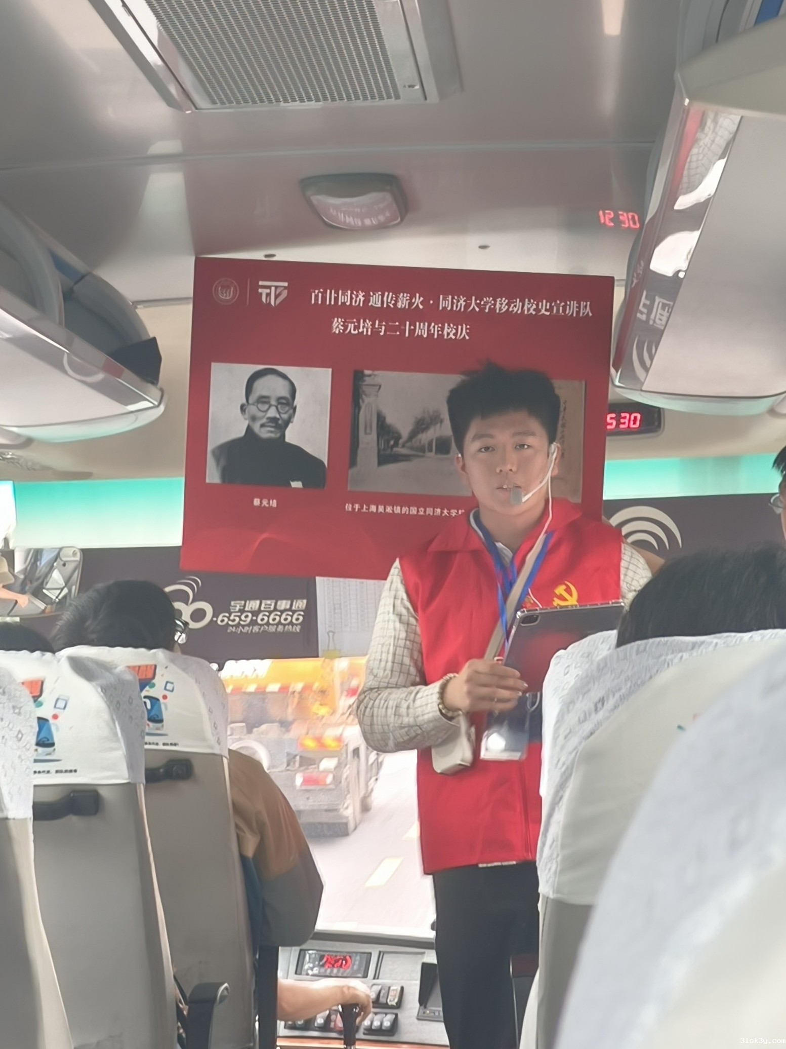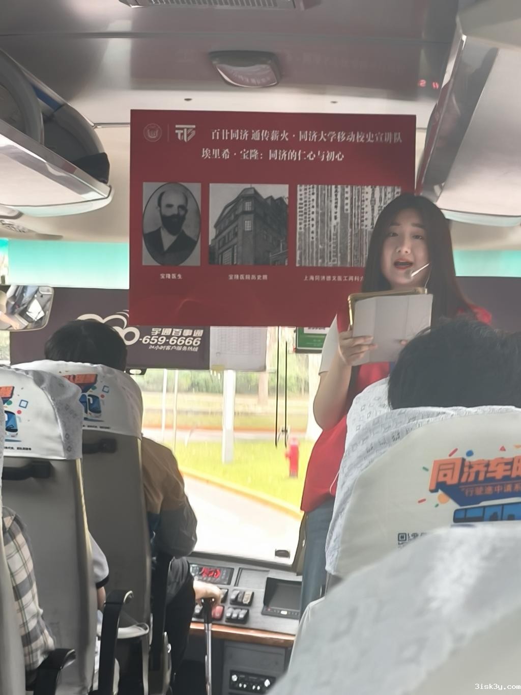 仪式结束后,移动校史专列搭载着首批乘客启程。短驳车身上鲜明热烈的主题标语在葱茏的梧桐树叶映衬下熠熠生辉。在约30分钟的旅途中,宣讲队员为同学们带来了《埃里希·宝隆:同济的仁心与初心》和《蔡元培与二十周年校庆》两个校史小故事。宣讲员以声情并茂的讲述和珍贵的历史影像,带领同学们穿越时空长廊,真切触摸到先辈们筚路蓝缕的奋斗足迹和永不言弃的精神丰碑。在校史知识竞答环节,乘客们踊跃抢答,在趣味互动中感悟同济百年底蕴。随着首班专列顺利返航,这场跨越时空的精神对话暂告段落,但属于新时代同济人的传承故事,正在车轮上续写新的篇章。当历史遇见未来,当记忆融入日常,这辆承载着百廿荣光的校史专列,正鸣响新时代的汽笛,驶向更加壮阔的育人征程。