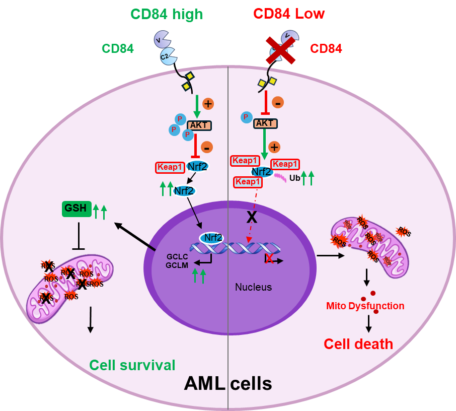 在机制研究中,研究者发现CD84敲降重塑AML细胞的代谢平衡并诱导线粒体应激。RNA-seq分析显示,CD84的缺失抑制多条能量代谢通路。功能实验证实,CD84敲降显著降低AML细胞氧耗率、糖酵解及脂肪酸氧化能力,并引起线粒体形态紊乱、膜电位丧失及功能障碍;这些损伤可通过CD84的重新表达得到部分恢复。进一步研究发现,CD84敲降抑制谷胱甘肽合成,削弱抗氧化防御能力,增强ROS积累,提示其通过维持氧化还原稳态中的重要作用。此外,CD84有助于维持转录因子NRF2的蛋白稳定性及核转位,促进抗氧化响应元件的转录活性,而其敲降则增强NRF2与其抑制蛋白KEAP1的结合,促进NRF2泛素化降解,抑制抗氧化转录程序。综上,CD84通过调控能量代谢、维持线粒体稳态及抗氧化系统,在AML细胞中发挥的生存调控作用。