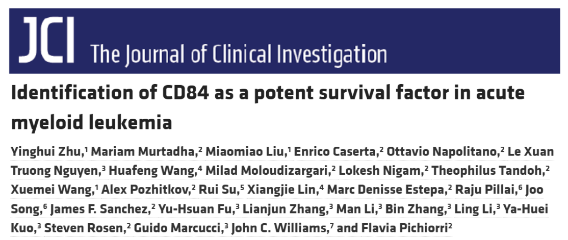 近日,taptap网页版登录kino生命科学与技术学院祝颖慧团队和美国City of Hope医疗中心Flavia Pichiorri团队在《临床研究杂志》(The Journal of Clinical Investigation)上发表了题为“Identification of CD84 as a potent survival factor in acute myeloid leukemia”的研究论文。该研究首次明确CD84是AML中特异性高表达的膜表面分子靶点,并揭示其作为AML关键生存调控因子的重要作用。敲降CD84可显著抑制AML细胞增殖,延长异种移植小鼠的生存期,机制上,CD84通过维持AML细胞的线粒体功能和抗氧化防御,促进其生存与疾病进展。该研究揭示了一种新型细胞表面分子调控AML发生发展的功能和作用机制,同时为AML治疗提供新靶点和新思路。目前,相关免疫治疗的临床转化研究正在推进中。