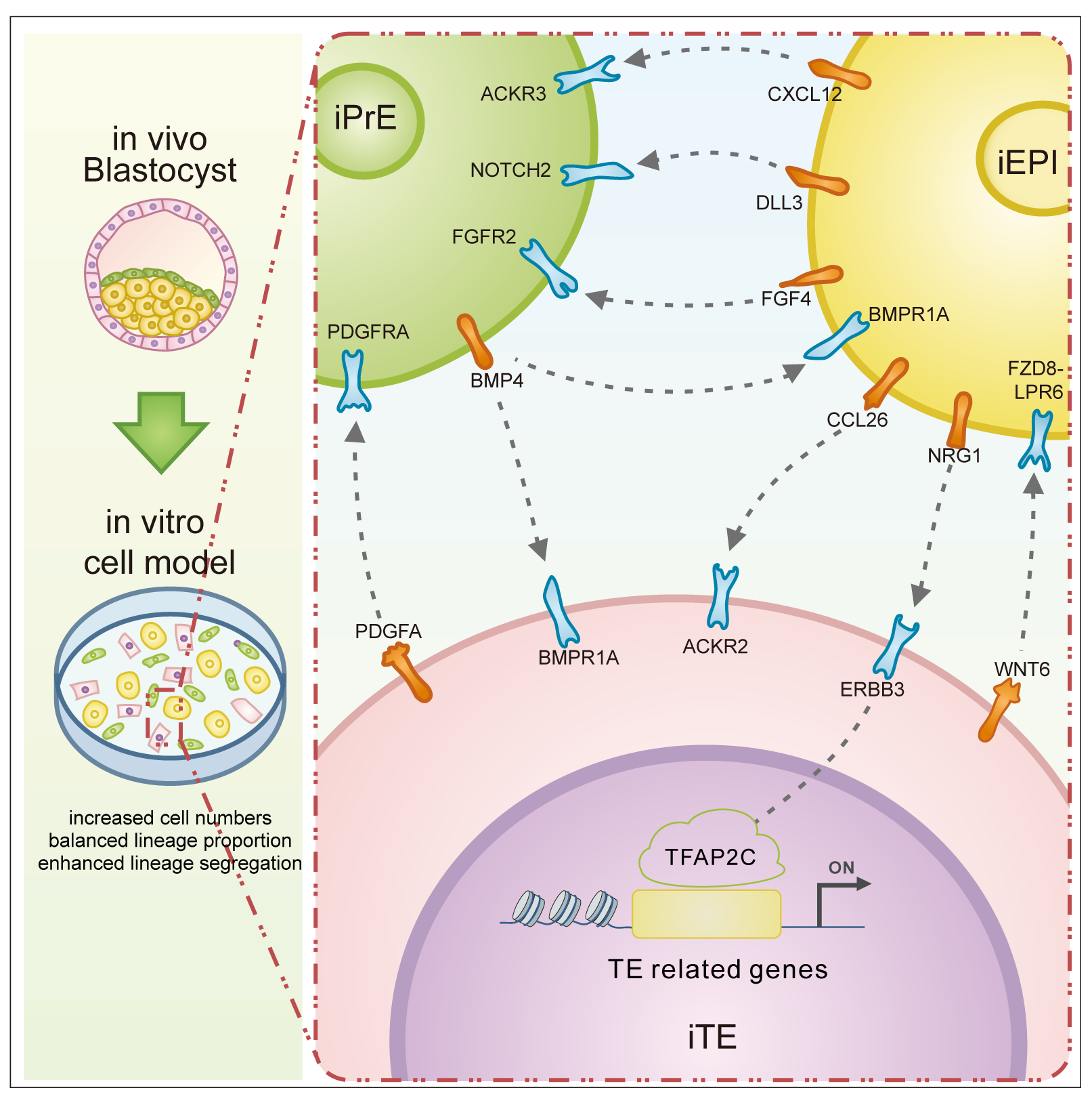 此外,该研究还结合基因共表达网络分析,确立了TFAP2C在NRG1-ERBB3通路中作为下游效应因子的核心作用,揭示NRG1-ERBB3通路通过调控TFAP2C介导TE命运的实现。研究系统揭示了人囊胚期三谱系间的细胞通讯互作图谱,并鉴定出NRG1-ERBB3-TFAP2C信号轴作为EPI调控TE谱系命运的重要机制之一。这一发现不仅深化了人类胚胎发育早期命运决定机制的理解,也为构建更完善的人囊胚体外模型与相关疾病的研究奠定了理论基础。