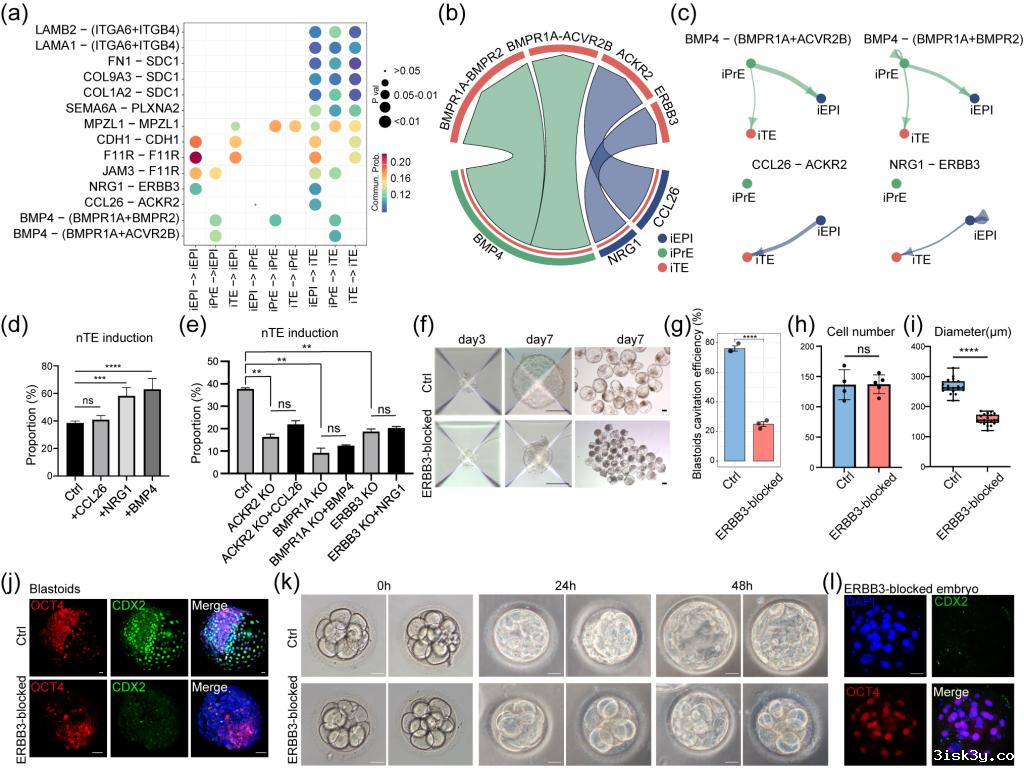 研究发现分泌性NRG信号通路显著富集于“EPI→TE”通讯网络,EPI谱系通过分泌NRG1与TE细胞表面的ERBB3受体互作。通过体外滋养层细胞诱导实验,该研究发现并证实了NRG1-ERBB3互作信号对TE谱系细胞命运决定的重要作用,并进一步在类囊胚形成和天然胚胎发育实验中得到了充分验证:敲除或抑制ERBB3受体都显著抑制囊胚腔的形成与TE标志基因的表达,进而阻碍胚胎发育进程。