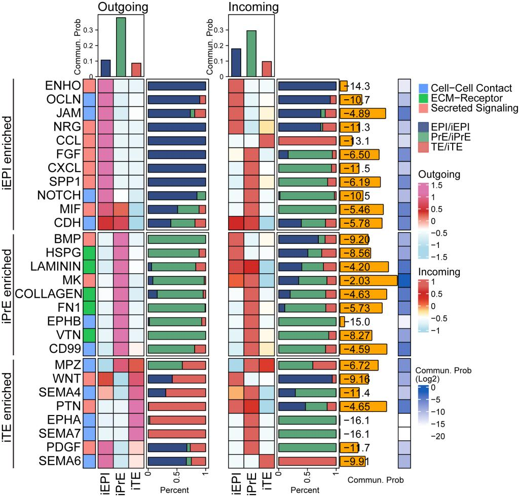 研究团队前期通过系统分析人类胚胎干细胞从primed态向naive态(primed-to-naïve)诱导过程中的单细胞转录组数据,绘制了高分辨率的细胞命运转变图谱,发现在诱导第8天会同时出现分别具有人植入前EPI、TE和PrE三胚层谱系特征的中间细胞亚群(iEPI、iTE、iPrE)。进一步借助CellChat细胞互作分析工具,研究团队系统绘制了人囊胚期三胚层间的复杂细胞通讯互作网络,涵盖多种分泌型、细胞-细胞接触型及细胞外基质互作类信号通路。