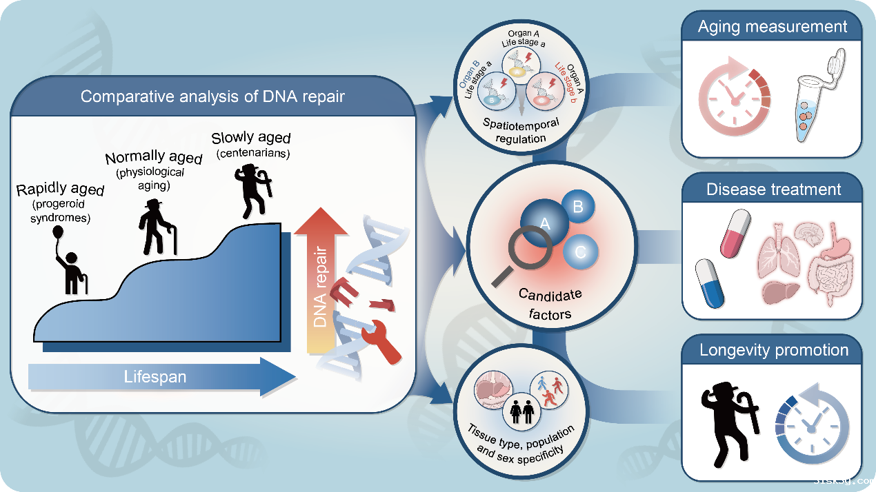 DNA承载着维持生命活动必需的遗传信息。然而,在内外多重因素的威胁下,DNA会发生多种类型的损伤,危害基因组稳定性,进而驱动衰老及相关疾病的发生。目前,由于人类研究样本稀缺,DNA修复及衰老的交叉研究主要依赖小鼠等动物模型。然而,小鼠衰老过程中的修复动态变化及其生物学影响能否完全反映人类特征仍不明确。因此,探究人类衰老及长寿相关的修复调控机制仍是未来研究的核心方向。事实上,人类在衰老速率和寿命上展现出显著的多样性——从早衰症(加速衰老)到长寿人群(慢速衰老),寿命跨度差异近十倍。这为开展DNA修复的比较研究提供了绝佳视角。