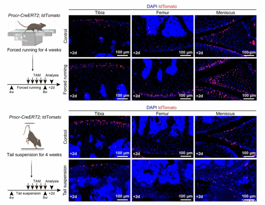 研究人员发现,Procr⁺软骨干细胞主要分布在膝关节胫骨平台和半月板等受力较大的软骨浅表层,具有持续分化产生中层/深层软骨细胞的能力,从而密切调控出生后关节软骨稳态。研究发现,增加力学刺激能够显著升高关节软骨和半月板中Procr⁺细胞的数量,而减少力学刺激则显著降低关节和半月板中的Procr⁺细胞数量,表明力学刺激密切调节关节软骨中Procr⁺细胞的分布和数目。