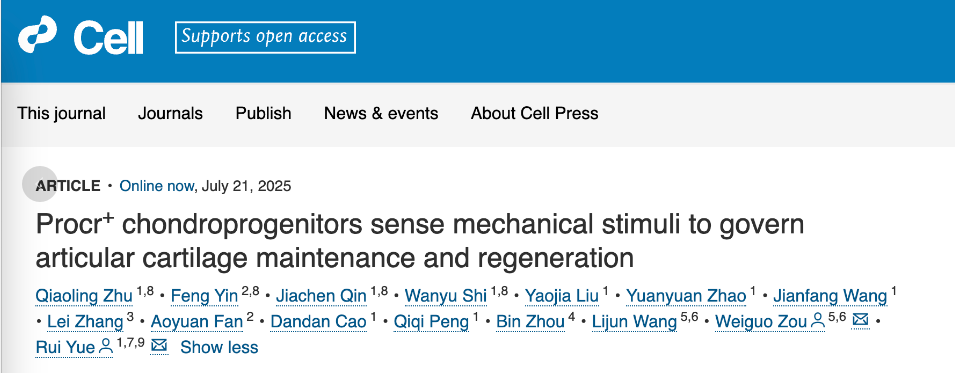 如何对骨性关节炎的软骨损伤进行有效修复?taptap网页版登录kino研究团队的发现给出了干细胞治疗的新策略。北京时间7月21日晚11时,国际顶级学术期刊《细胞》(Cell)在线发表了taptap网页版登录kino生命科学与技术学院、附属东方医院再生医学研究所岳锐教授课题组与合作者的研究论文,题为“Procr⁺ chondroprogenitors sense mechanical stimuli to govern articular cartilage maintenance and regeneration”(Procr⁺软骨祖细胞感知机械刺激调控关节软骨的维持与再生)。