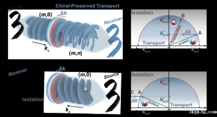 非对称传输是保障信息安全与系统鲁棒性的重要物理机制,但现有方案往往通过角向调制等方式引入外部动量,从而破坏涡旋波的手性,造成信号失真与通道串扰。研究团队利用径向模态自由度,通过轴向调制的声学超构材料驱动涡旋声波径向模态单向演化,实现了正向透射、反向完全隔离的极端非对称传输特性(图1)。