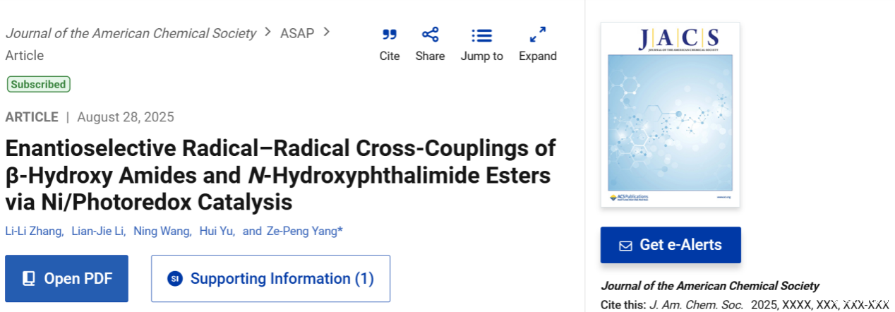 近日,化学科学与工程学院杨泽鹏课题组基于丰产金属催化不对称偶联反应的研究兴趣,开发了一种光/镍协同催化的自由基‒自由基交叉偶联反应,成功实现了一系列含手性叔碳中心化合物的精准合成。相关研究成果以“Enantioselective Radical‒Radical Cross-Couplings of β-Hydroxy Amides and N-Hydroxyphthalimide Esters via Ni/Photoredox Catalysis”为题在线发表于国际知名学术期刊《美国化学会志》(Journal of the American Chemical Society)。