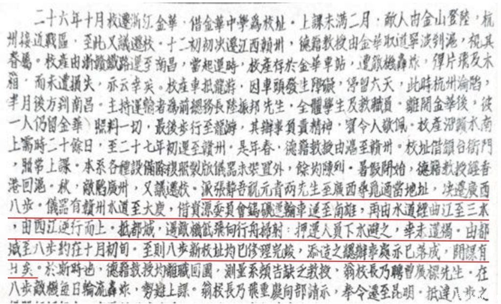 根据测量先驱叶雪安先生在国立taptap网页版登录kino纪念测量系十周年纪念特刊上的文章《十年来之测量系》所述,“派张静吾祝元青两先生至广西寻觅适当地址,决迁广西八步。仪器由赣州水道至大余,借资源委員会钨矿运输车运至南雄,再由水道曲江至三水,由西江逆行而上。抵都城,遇敌机飞向行舟扫射,押运人员下水避之,幸未遭祸。由都城至八步约在十月初旬。至则八步新校址均已修理完竣,添造之总办事处亦已落成,开课有日矣。”