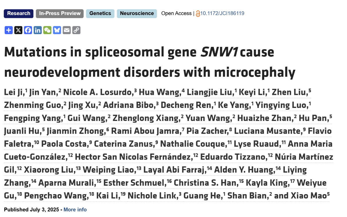 生命科学与技术学院边杉/毛翛/贺光等课题组揭示SNW1杂合突变导致伴原发性小头畸形神经发育障碍及其机制研究,成果发表于《临床研究杂志》