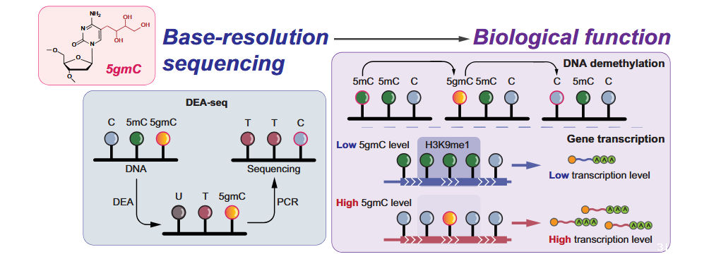 研究团队利用商品化DNA脱氨酶混合物(DEA)将DNA上的C和5mC脱氨为U或T,而5gmC因带有较大的甘油基可以抵抗DEA的脱氨作用,从而被保留为C。利用这个原理所建立的“DEA-seq”技术仅需一步反应就可以实现对5gmC的精确检测,不仅操作简便,且反应条件温和,因此所需DNA量少,适用于微量样本甚至单细胞测序。该方法也体现了使用单一脱氨酶区分不同DNA修饰的优越性与可靠性,但也强调了发现不同特性的脱氨酶与相应应用场景的重要性。