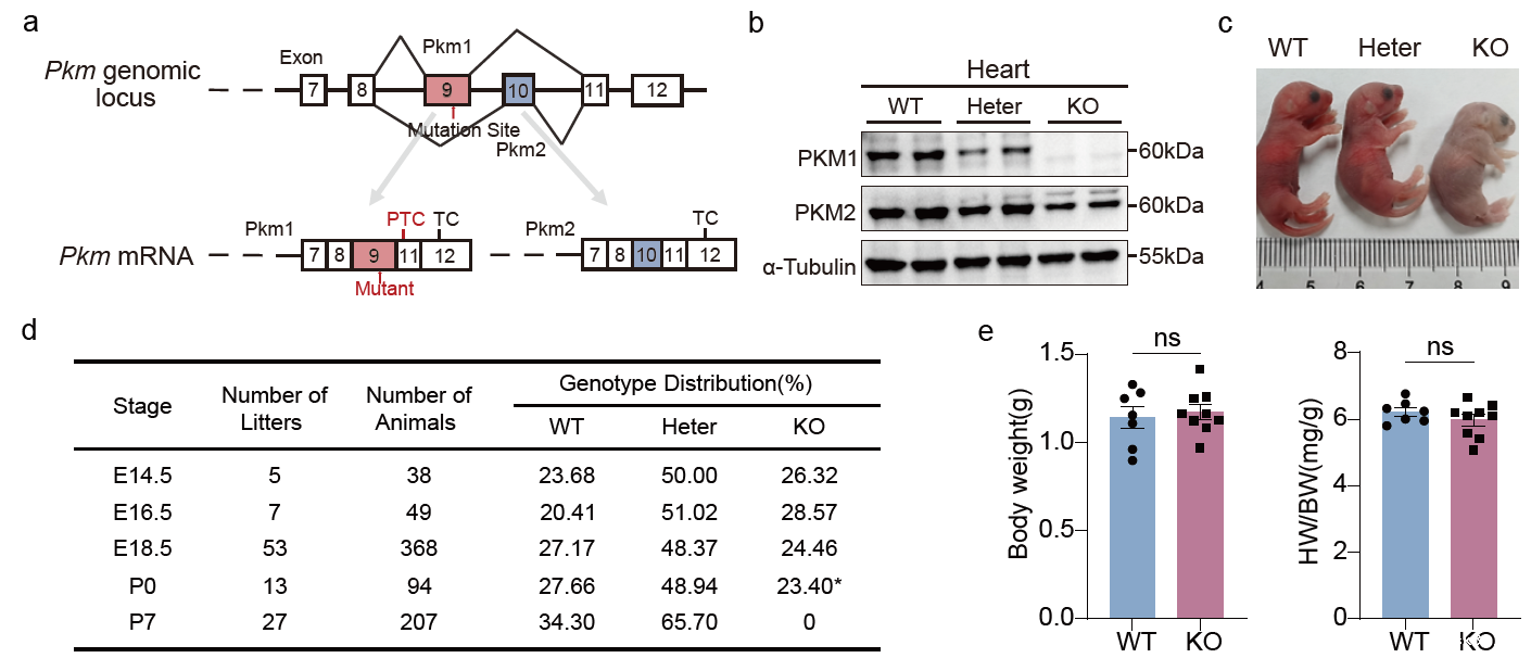心脏是哺乳动物胚胎期最早发挥功能的器官,其发育过程中既要维持强大的能量供给以保证搏动,又要通过心肌细胞的增殖不断扩大体积和完善结构,从而为出生后的循环系统功能奠定基础。糖酵解关键酶丙酮酸激酶M型(PKM)存在两种剪接亚型:PKM1和PKM2,在能量供应和代谢平衡中发挥不同作用。PKM1以高活性的形式广泛存在于高能耗组织中,然而此前由于PKM1敲除常常伴随PKM2代偿性上调,其在心脏发育中的独立作用一直存在争议。阐明PKM1在胚胎心肌细胞增殖及心脏发育中的真实功能,对于理解心脏能量代谢与结构发育之间的联系具有重要意义。
