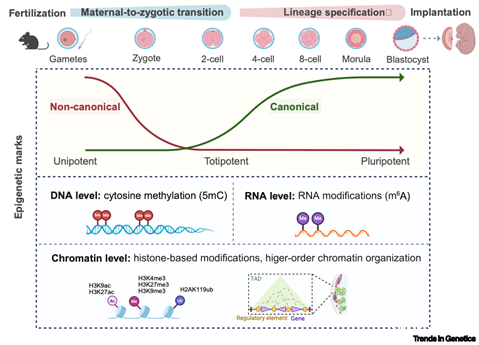 图1. 哺乳动物着床前胚胎发育过程中的表观遗传动态调控