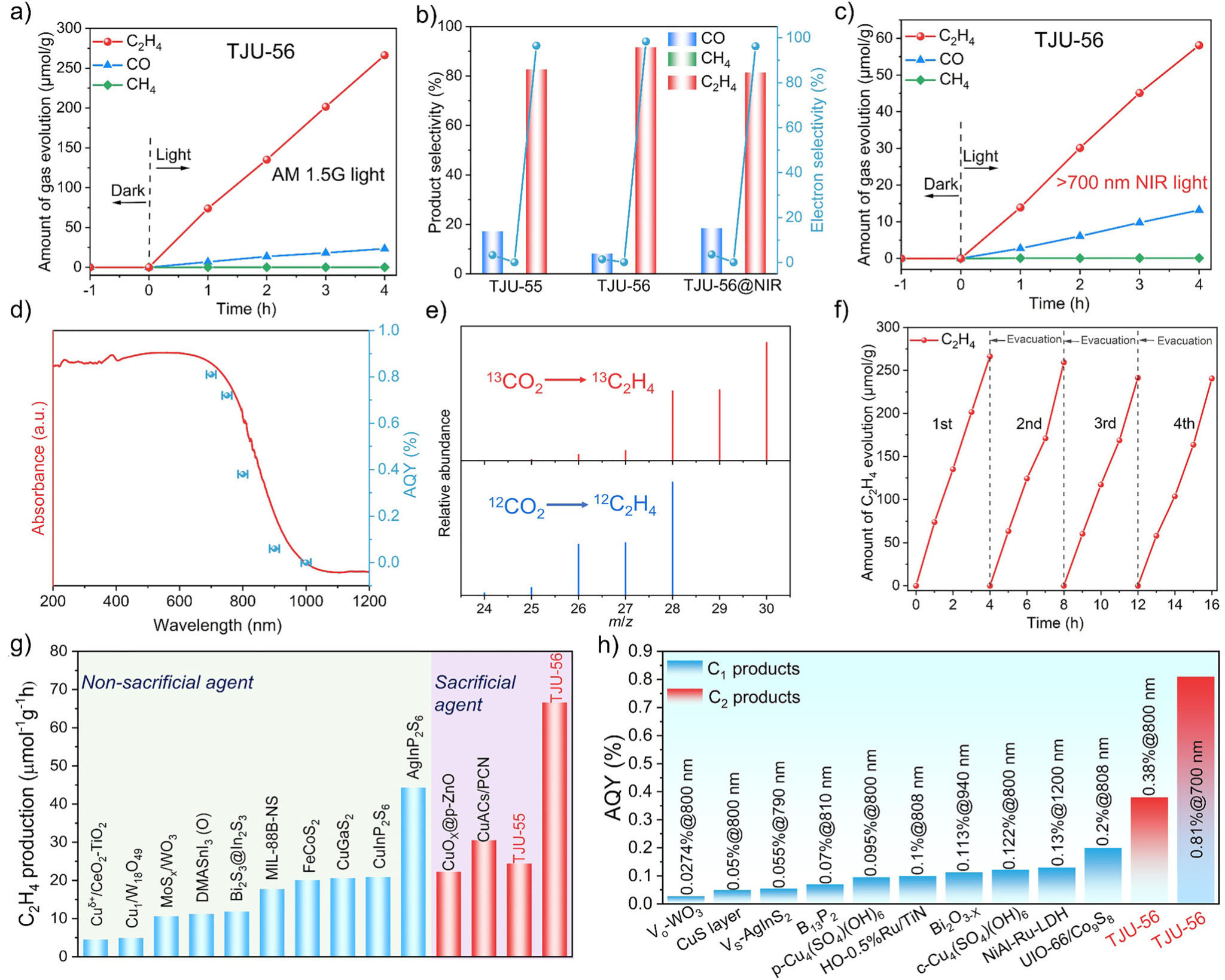 光催化CO2还原的实验结果显示,在模拟太阳光下,紫精修饰的层状碘化铅可高选择性光催化CO2还原至C2H4产物,产率达66.59μmolg–1h–1,对C2H4的电子选择性高达98.4%,性能位居所有报道光催化剂的前列。更重要的是,在>700nm的近红外光下,该催化剂的C2H4产率仍达14.52μmolg–1h–1,且在700nm和800nm处的表观量子效率(AQE)分别达到0.81%和0.38%,其性能超越了绝大部分近红外光催化剂。13CO2同位素标记实验以及对照实验证实了C2H4产物碳源完全来自CO2。连续循环测试显示催化剂性能稳定,展现了良好的实际应用前景。