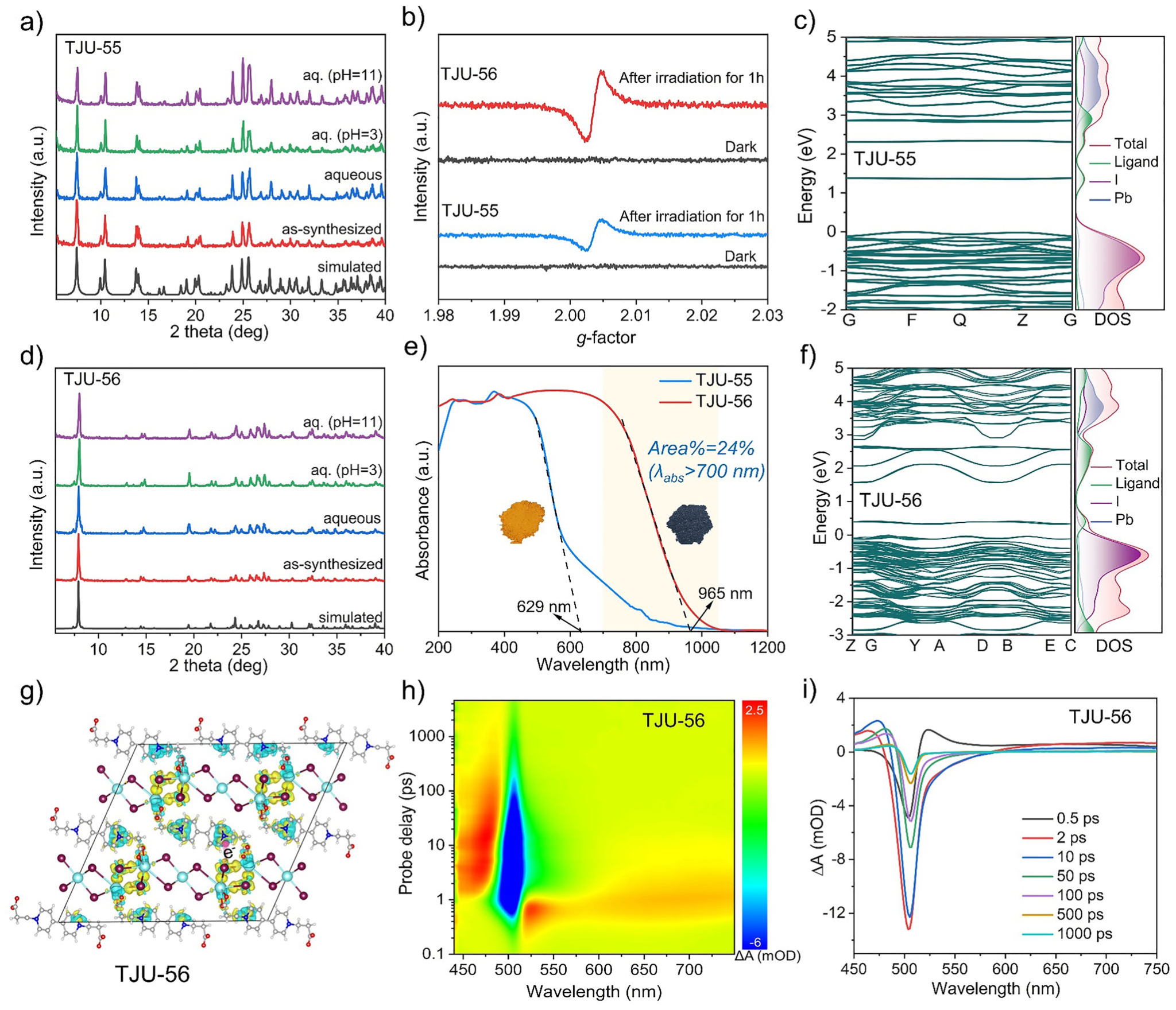 通过采用相同紫精配体和精准调控合成条件,本研究成功实现了紫精基卤化铅从基于一维Pb4I8链状结构到二维Pb3I6层状结构的维度工程。在二维结构中,紫精配体作为层间支柱,采取平行堆叠模式,使得相邻的氮活性位点距离缩短至约4.7Å,为后续C–C偶联提供了有利的空间环境。稳定性测试表明,紫精修饰的一维和二维卤化铅均表现出优异的结构稳定性,EPR测试证实了二维结构能更有效地产生并稳定氮自由基。紫外-可见漫反射光谱显示该材料的吸收边成功延伸至965nm近红外光吸收区,带隙窄至1.28eV,且其能带结构在热力学上满足CO2还原半反应的要求。结合DFT计算、原位XPS及飞秒瞬态吸收光谱分析发现,在光照条件下,电子从富电子碘化铅层迅速转移至缺电子的紫精单元,从而实现高效的分子内光诱导电子转移过程。