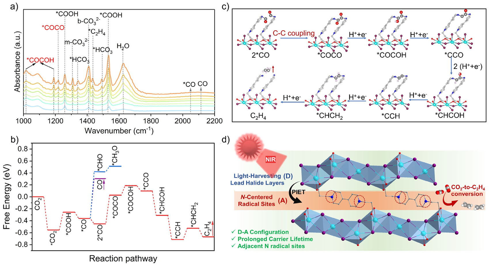 采用原位漫反射红外傅里叶变换光谱(in situ DRIFTS)对光催化CO2还原过程中产生的中间体进行追踪,成功观测到位于1218cm-1的关键中间体*CO–CO的特征峰,为C–C偶联的发生提供了直接实验证据。DFT反应自由能计算表明,在紫精修饰的二维层状结构中,两个CO中间体偶联形成CO–CO的能垒仅为0.479eV,远低于生成CHO或直接脱附为CO的路径,从而在热力学上显著促进了C2产物的高选择性生成。该过程得益于材料独特的D–A结构,不仅确保了光生载流子的高效积累,其紧密靠近的相邻紫精氮自由基更为C–C偶联提供了空间活性位点,二者协同作用共同促成了高效、高选择性的近红外光催化过程。