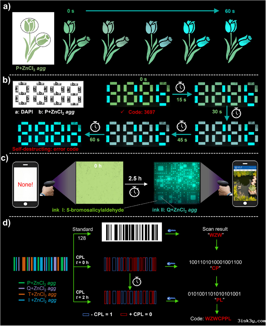 图4、动态响应的CPL和荧光信号用于固态粉末材料中的信息编码功能展示