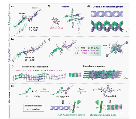 图2、对二甲苯溶剂诱导氯桥链接的二聚体构象转变及其超分子组装体手性信号反转
