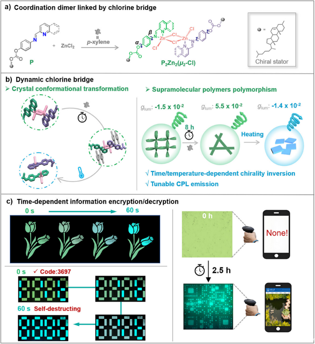 图1、a)基于氯桥键的手性二聚体配合物分子结构;b)构象转变及氯桥键断裂引发两次手性反转与CPL发射波长调控的机理示意图;c)时间响应型发光与CPL信号反转在信息加密中的原理示意图