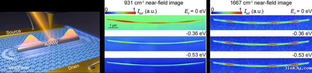 该论文构建了一种银纳米线-石墨烯异质结构电学器件,探索银纳米线上SPPs的电学调控特性。器件通过调节栅极电压动态改变石墨烯费米能量,以影响银纳米线SPPs的传播性质。利用散射式扫描近场光学显微技术,实验同步实现了SPPs的激发与观测,清晰展示了其电学调控效果(见图1)。结合实验观测与理论仿真,研究进一步揭示了银纳米线SPPs动态调控的波长选择性,并表明其调控机制并不是之前广泛报道的极化激元杂化,而是基于SPPs与石墨烯极化激元之间的能量转换(见图2)。该成果不仅为中红外波段银纳米线SPPs的有效调制提供了可行方案,也为更广泛的极化激元调控研究提供了基础,为实现动态可调的纳米光子器件开辟了新方向。