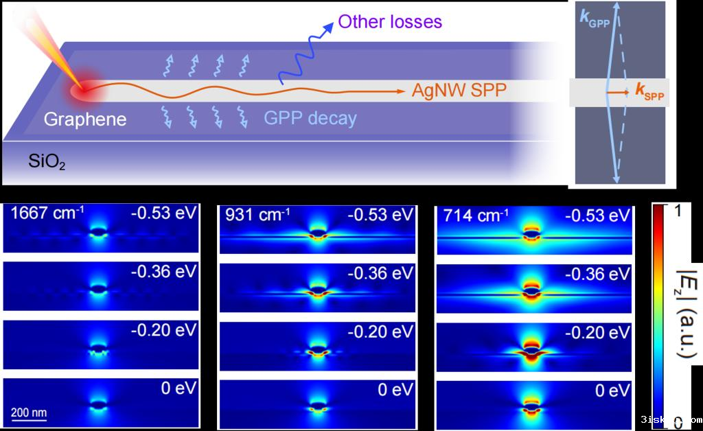 图2. SPPs能量耗散机制示意图(上)和不同波段银纳米线激发GPPs仿真结果(下)