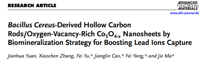 近日,环境科学与工程学院马杰团队在《先进功能材料》(Advanced Functional Materials)上发表题为“Bacillus Cereus-Derived Hollow Carbon Rods/Oxygen-Vacancy-Rich Co3O4-x Nanosheets by Biomineralization Strategy for Boosting Lead Ions Capture”的研究论文,在微生物合成金属氧化物电化学高效除铅方面取得新进展。
