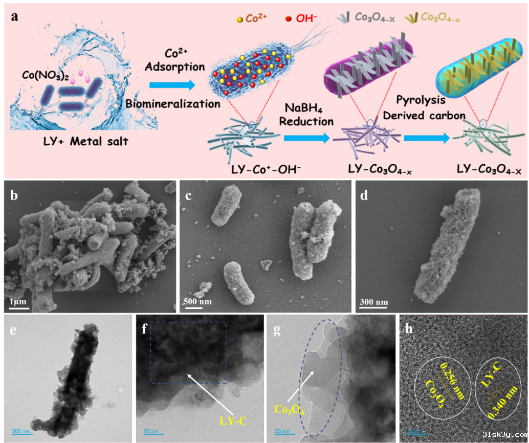 基于前期酵母“代谢转化”合成NiCoP@NPC和聚磷菌的“代谢催化”合成LFP@C进行离子分离的研究基础,该研究创新性采用Bacillus cereus“生物矿化”功能,成功构建了一种由中空衍生碳棒(LY)包覆富含氧空位的Co3O4-X纳米片(LY-Co3O4-X)的复合电极材料。中空的LY不仅形成了三维导电网络,还充当支撑骨架,减轻了Co3O4-X的聚集和粉碎,从而保持了电极的活性。高度分散的Co3O4-X纳米片缩短了离子传输路径,增强了LY-Co3O4-X的反应动力学。LY-Co3O4-x的界面耦合促进了电子的重新分布和电荷的快速转移,加速了Pb2+的水合化、水化层脱除及离子分离过程。基于以上优势,LY-Co3O4-X在1.60 V的工作电压下展现出卓越的Pb²⁺去除性能(Pb²⁺吸附容量可达78.7 mg g⁻¹,吸附速率为2.62 mg g⁻¹ min⁻¹),超越了绝大多数已报道的电极材料,并且呈现出优异的长寿命循环性能。这一发现为微生物构建金属氧化物并调控其电化学活性开辟了新途径。