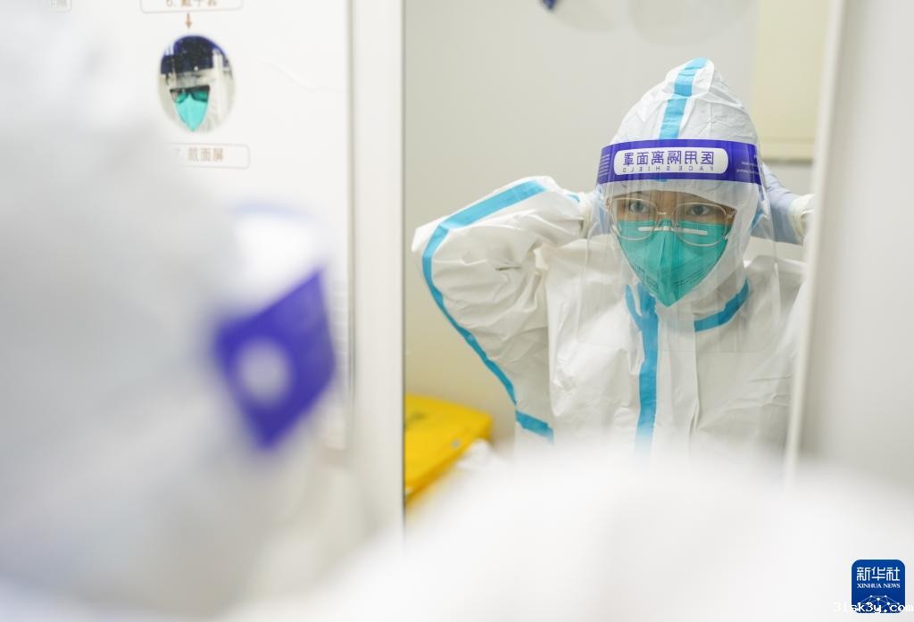 3月23日凌晨,核酸检测实验室的工作人员吕文航在穿戴防护面罩。