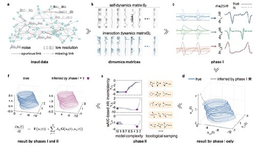 以往的研究着重于单节点或少量节点动态方程的推理,对于包含大量节点的复杂网络系统而言,这个问题面临更多挑战。例如,不仅节点活动数据含有噪声,而且网络结构数据可能不准确,节点的自身动力学可能具有异质性,系统宏观行为可能会掩盖节点之间动态耦合的微观机制。