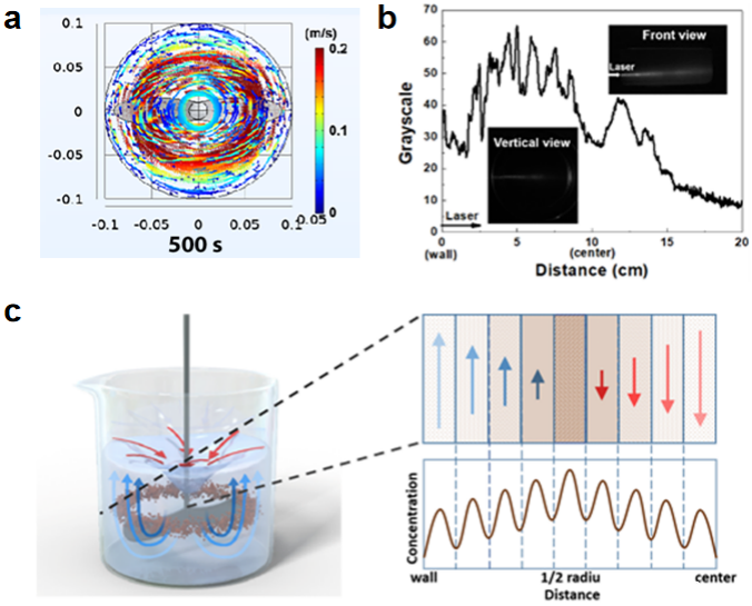 该研究还发现存在搅拌器驱动所导致的局域纳米粒子浓度升高、层流间纳米粒子局域聚集的现象。
