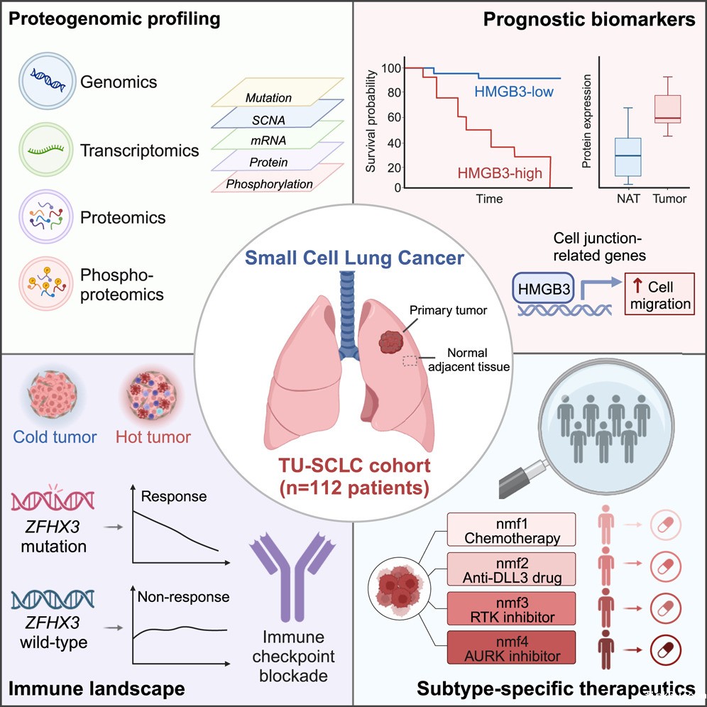 研究团队对112例小细胞肺癌患者的肿瘤组织和配对癌旁组织样本进行了蛋白基因组学分析,通过整合基因组、转录组、蛋白质组、磷酸化蛋白质组等多维组学数据,系统揭示了小细胞肺癌的分子特征,为小细胞肺癌的发生发展机制、预后监测、分子分型和个性化治疗策略提供了新思路。