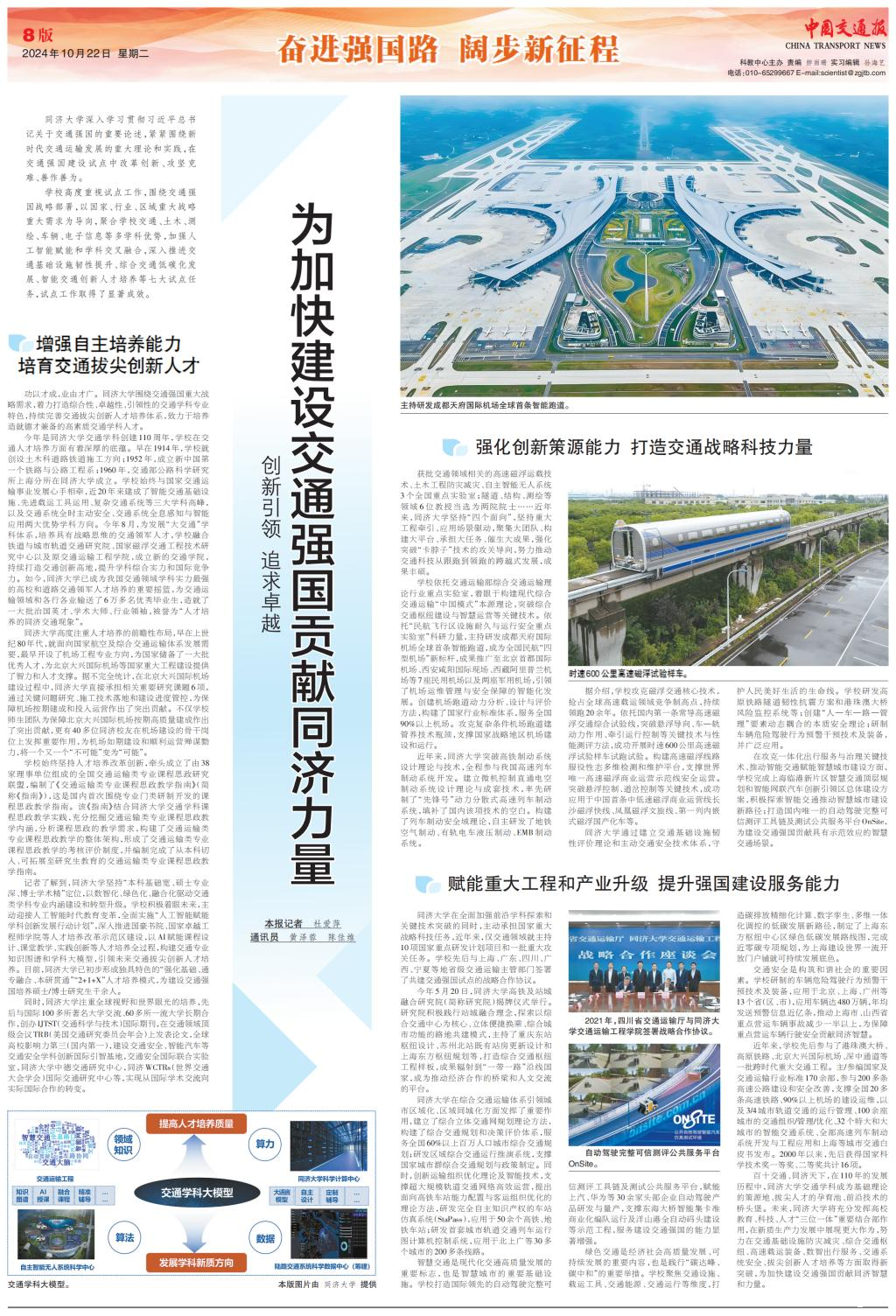 智慧交通是现代化交通高质量发展的重要标志,也是智慧城市的重要基础设施。学校打造国际领先的自动驾驶完整可信测评工具链及测试公共服务平台,赋能上汽、华为等30余家头部企业自动驾驶产品研发与量产,支撑东海大桥智能集卡准商业化编队运行及洋山港全自动码头建设等示范工程,服务建设交通强国的能力显著增强。
