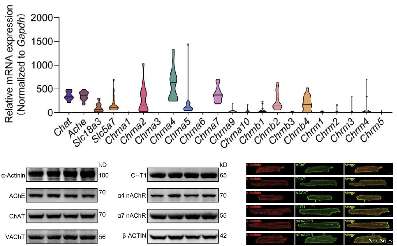 研究团队发现,心室心肌细胞存在一个自身固有的胆碱能系统,包括乙酰胆碱递质囊泡、乙酰胆碱转运体、乙酰胆碱代谢酶以及不同亚型的胆碱能受体等关键元件。
