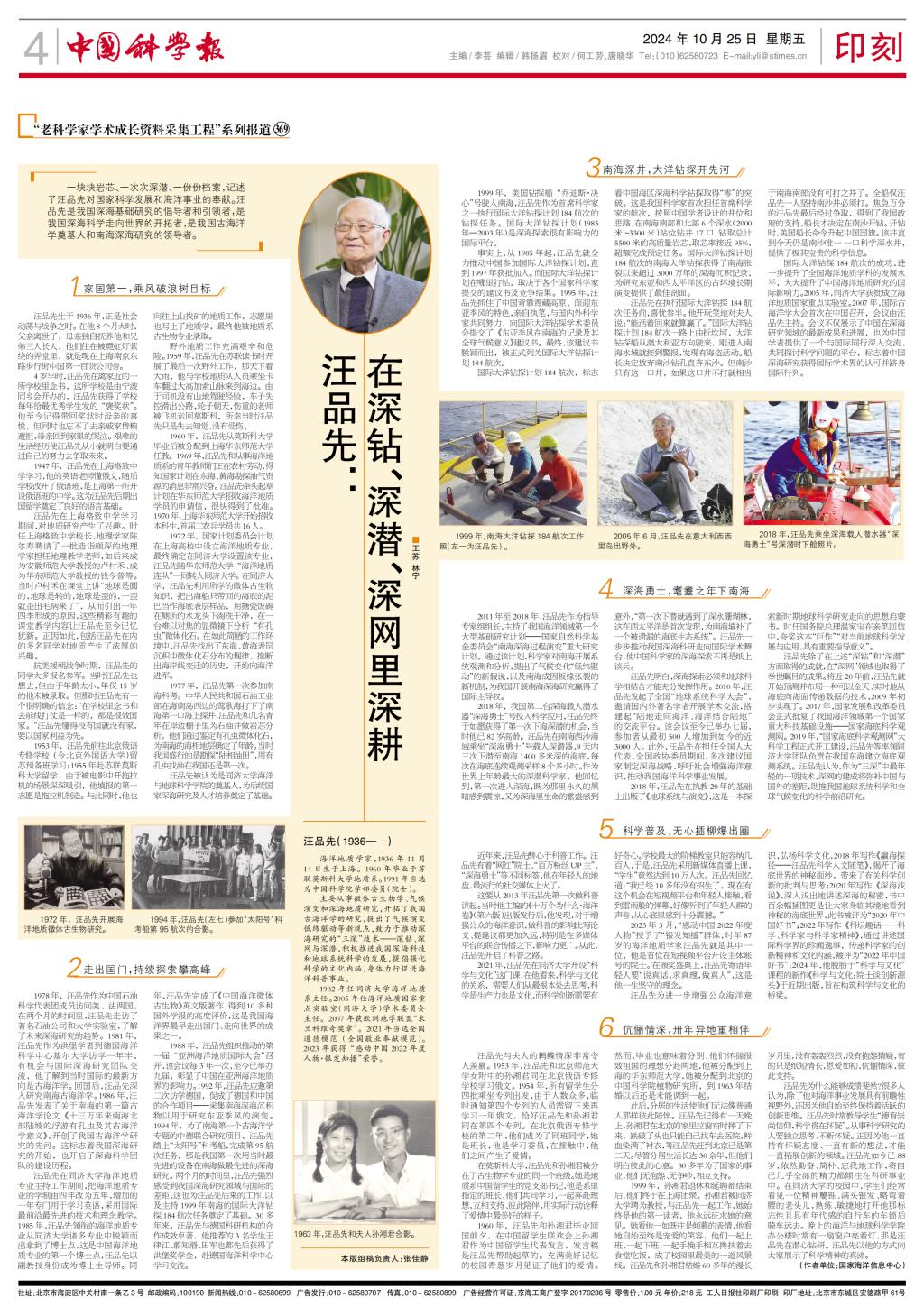 一块块岩芯、一次次深潜、一份份档案,记述了汪品先对国家科学发展和海洋事业的奉献。汪品先是我国深海基础研究的倡导者和引领者,是我国深海科学走向世界的开拓者,是我国古海洋学奠基人和南海深海研究的领导者。