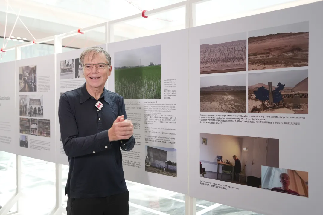 展板上的一张张照片定格了“东游记”的重要时刻和他的思考。在一片稻田前,奥雷·伯曼拍下一张照片:前景是一片绿油油的稻田,远处是一座白色的巨大风车。这个中国人司空见惯的画面,在他看来,却是一幅新旧能量交织的美丽景色。自古以来,粮食为人类提供能量,而如今,风车则是新能源的代表。由此,他联想到汉字“和”,“‘和’字由象征稻田的‘禾’、象征需求和消费的‘口’组成:没有人,稻米无用;没有稻米,人难以生存。稻米与人相结合,共同孕育出社会与文明。中国人关于和谐、天人合一的理念大概就藏在这个‘和’字里了。”透过眼前的景象,奥雷·伯曼看到了人的核心价值观在汉字中得以体现,也感受到了中国语言和文化的深厚底蕴。