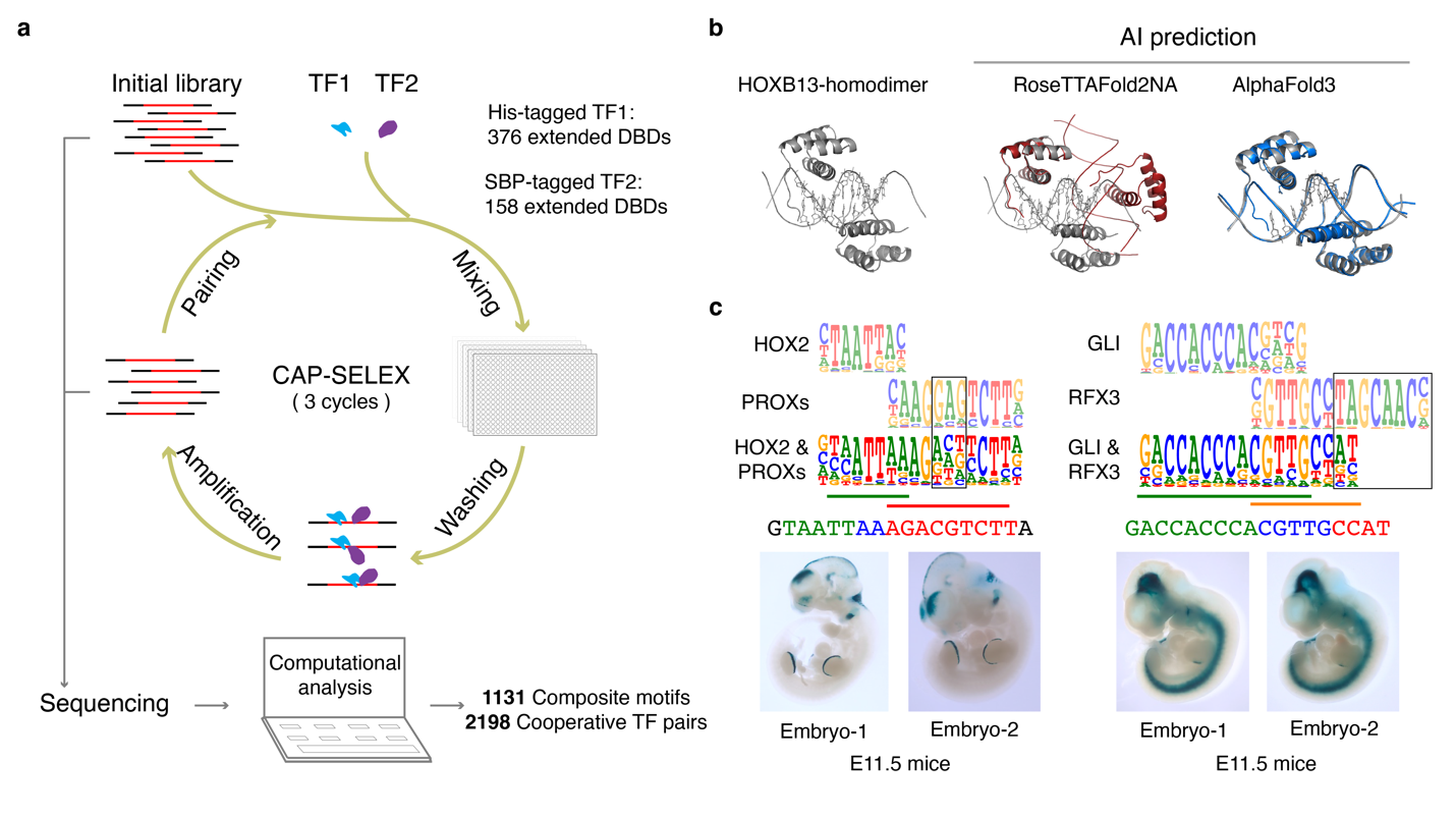研究团队借助高通量筛选技术和计算生物学手段,系统评估了58000多种转录因子组合,鉴定出2198对协同作用的转录因子,并解析了协同作用转录因子识别的DNA基序。
