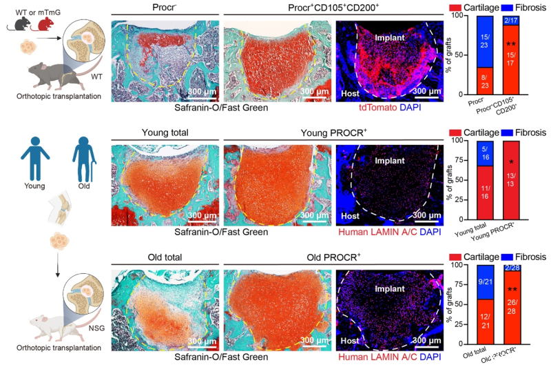 值得一提的是,研究人员在年轻和老年人关节软骨样本中分离纯化出了性质类似的PROCR+细胞,并通过体内移植实验证明其相较于成熟软骨细胞具有更稳健的软骨修复能力。