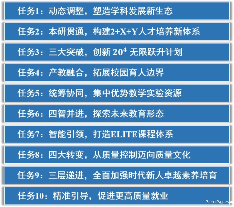 会上,部署了十大重点改革任务,分别是:一是动态调整,塑造学科发展新生态;二是本研贯通,构建2+X+Y人才培养新体系;三是三大突破,创新204 无限跃升计划;四是产教融合,拓展校园育人边界;五是统筹协同,集中优势教学实验资源;六是四智并进,探索未来教育形态;七是智能引领,打造ELITE课程体系;八是四大转变,从质量控制迈向质量文化;九是三层递进,全面加强时代新人卓越素养培育;十是精准引导,促进更高质量就业。