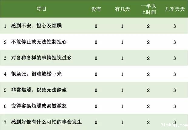 问卷由个体根据本人近2周的情况填写。表格中的数字为本项目的得分。7项得分累加超过或等于10分,就提示受测试者存在较显著的焦虑情绪,应该寻求专业帮助。