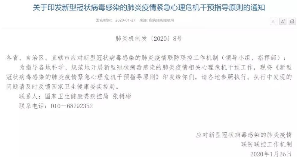 1月27日,国家卫生健康委员会网站发布《新型冠状病毒感染的肺炎疫情紧急心理危机干预指导原则》,旨在指导各地科学、规范地开展新型冠状病毒感染的肺炎疫情相关心理危机干预工作。
