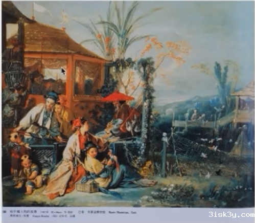 下图是18世纪法国洛可可绘画的代表人物布歇的一幅画。这幅画的前景人物的装束与造型是东方人的;背景是中国古典园林的凉亭模型。也就是说,几百年之前,中国园林的造型已被西方世界认知。