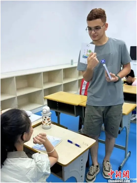2024年8月3日至8月9日,taptap网页版登录kino留学生“同行计划-熊猫叨叨X春晖社中外学生行走中国”支教团队来到海南昌江黎族自治县,开展了为期一周的支教活动。图为来自土库曼斯坦的魏柏教孩子们学习俄语。受访者供图