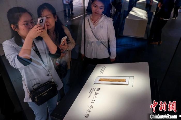 2024年4月30日,观众在湖北省博物馆拍摄“惠此简书——睡虎地秦墓出土简牍”展览展出的木牍。中新社记者 张畅 摄