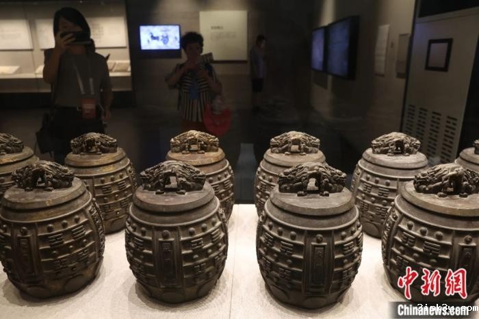 2024年7月11日,山东曲阜孔子博物馆收藏的八卦纹鎏金铜编钟吸引参观者。中新社记者 蒋启明 摄