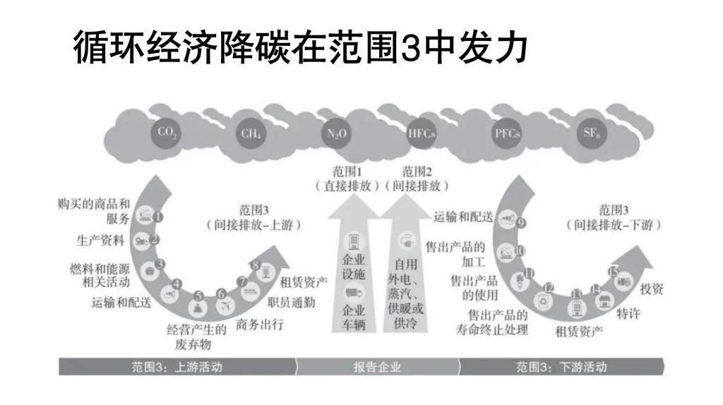 因此,诸大建认为:“循环经济降碳主要在范围3中发力,范围1、范围2与能源更相关。”在循环经济主要发力的四个领域——能源、工业、交通、建筑中,产品碳足迹核算涉及范围1、范围2、范围3。范围1指的是直接排放,如企业直接使用化石能源等产生的碳排放;范围2是间接排放,如企业使用火电产生的碳排放;范围3则指,上下游活动产生的间接排放。同时,诸大建指出,企业在范围3中发力循环经济要更精准细化,与降碳的四大领域结合。“企业必须了解所处行业上下游是谁,循环经济才能更好发力。”他说。